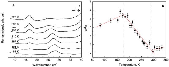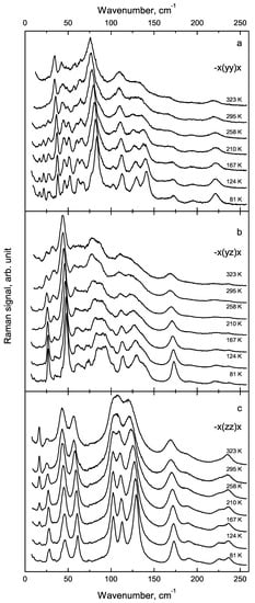 Temperature effects on low wavenumber part of Raman spectra were investigated at temperatures from 80 up to 330 K (Figure 4). In all polarised geometries Raman lines are quite narrow and separate at low temperatures, whereas heating leads to its broadening and overlapping. Thus, at room temperature, only a few broad and poor resolved bands can be observed in this region (Figure 4). The comparison of spectra measured in various polarisation geometries with the derived selection rules for backscattering (Table A2) and right-angle scattering geometry (Table A3) allowed us to attribute the most intense of them to the vibration symmetry (Table 2).