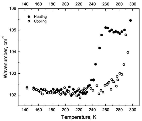 The line 105 cm was attributed to Phe-Phe twisting in the article [24]. This assignment is based on first-principle calculations. The observed hysteresis of the 105 cm line position, depending on whether we heat the sample or cool it (Figure 6). The temperatures of the spectral anomalies are 235, 255 and 278 K (Figure 6). The Figure A3 shows the dependence of the three low-frequency line positions on temperature.
