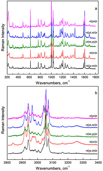 The spectral region from 280 cm to 3350 cm contains lines of functional groups vibrations and can be divided by two subregions. Polarised spectra of FF microtube for mid- and high-wavenumber regions (Figure 7a,b) can be used for determination of the orientation of FF molecules in the microtube.