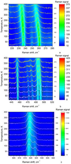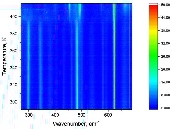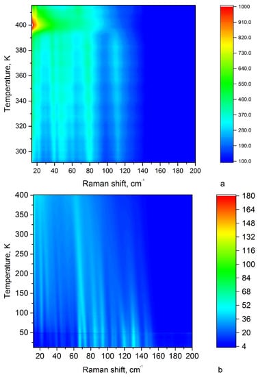 The experiments were carried out during heating and cooling in the temperature range from 290 K to 420 K to study the effects passing in the region of an irreversible phase transition. In the region of lattice vibrations, all modes change the temperature behaviour upon transition near 398 K. With temperature increasing, some lines expand and merge into a single contour in the vicinity of the phase transition (Figure 13a). After the phase transition, the sample was cooled. The intensity map of the lattice vibration is shown in Figure 13b. The picture does not repeat when heated and cooled. The number of lines during cooling after the transition increased. This fact indicates that the phase changed during the transition of 398 K.