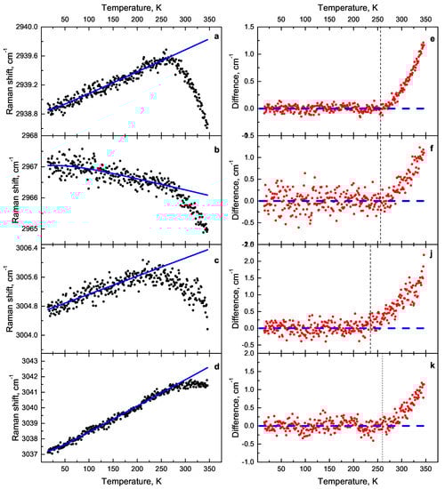 Dependence of the C−H stretching modes on temperature: (a) 2938 cm mode, (b) 2966 cm mode, (c) 3004 cm mode, (d) 3037 cm mode. The difference between the line position and its approximation depending on the temperature: (e) 2938 cm mode, (f) 2966 cm mode, (j) 3004 cm mode, (k) 3037 cm mode.