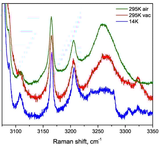 O–H vibration spectral region of the sample in air, in vacuum and at 14 K. Vac denotes measurements carried out in vacuum cryostat with internal pressure 10 mbar. Air measurements have done at ambient conditions.
