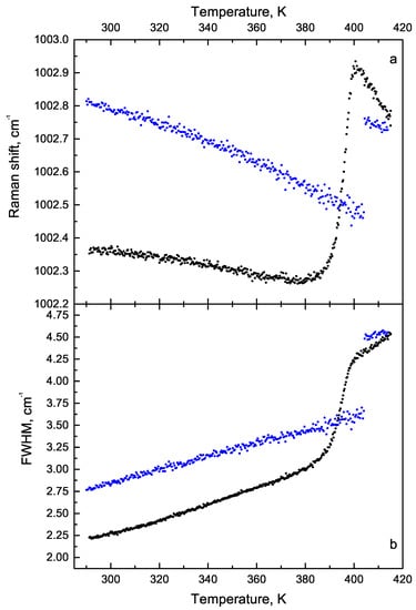 The temperature dependence: (a) of the position of the line 1002 cm, (b) its width. Black points—heating, blue points—cooling.