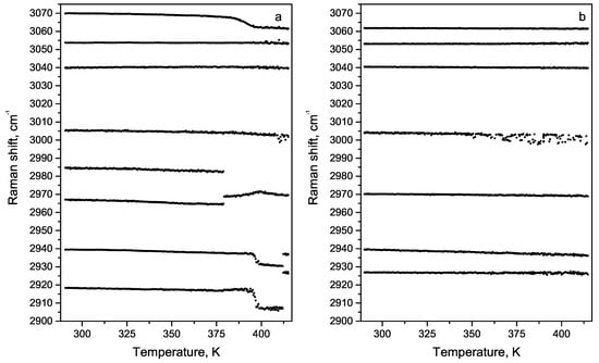 Spectral lines corresponding to stretching vibrations of CH and NH groups (located at 3050–3070 cm) and separated at room temperature merge together at 398 K (Figure 10). All these processes are accompanied by lines broadening due to temperature increases.