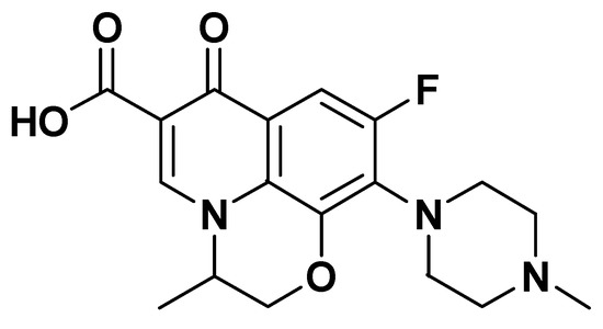Fluoroquinolones are broad-spectrum antibiotics particularly effective against gram-negative organisms, notably Pseudomonas aeruginosa. Moreover, they are often used to treat infections like pneumonia [1,2,3]. Generally, these antibiotics are well tolerated and confer very few side effects [4]. Second-generation quinolones, e.g., ciprofloxacin, enoxacin, lomefloxacin, norfloxacin, and ofloxacin (OFL; Figure 1), have greater systemic activity, potency against gram-negative strains, and atypical pathogen coverage. Therefore, compared to the first-generation drugs, the second-generation quinolones have broader clinical applications, including the treatment of skin infections, selected types of pneumonia, sexually transmitted diseases, pyelonephritis, and complicated urinary tract infections [5].
