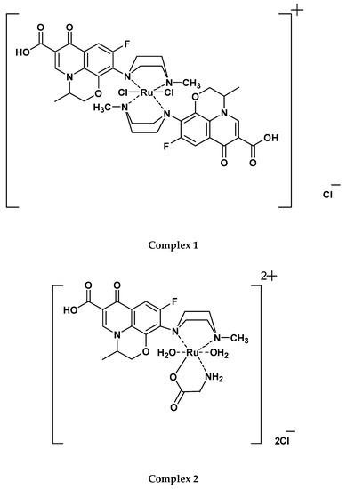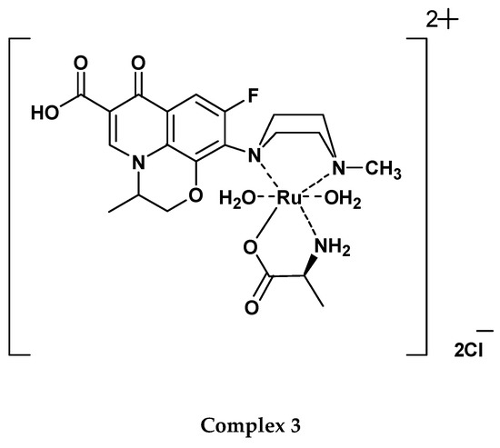 The microanalytical element analysis of the OFL complexes indicated 1:2 [Ru(III):OFL] and 1:1:1 [Ru(III):OFL:AA] stoichiometry for the Ru(III)-OFL complexes, as listed in Table 1. According to these results, proposed chemical structures for Complex 1; [Ru(OFL)2(Cl)2]Cl, Complex 2; [Ru(OFL)(Gly)(H2O)2]Cl2, and Complex 3; [Ru(OFL)(Ala) (H2O)2]Cl2 are provided in Figure 3.