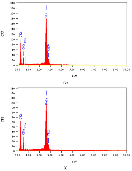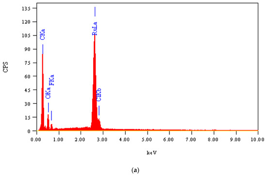 A Perkin Elmer CHN 2400 (PerkinElmer Inc., Shelton, USA) was used to conduct the analysis of %C, %H and %N element content. Ru and H2O content were determined gravimetrically. A Jenway 4010 conductivity meter (Jenway, Staffordshire, UK) was used for the molar conductivity measurements of the samples at 10−3 M in dimethylsulfoxide (DMSO). A UV2−Unicam UV/Vis spectrophotometer (METTLER TOLEDO, Columbus, OH, Country) was used to scan the UV−vis absorption spectra for samples dissolved in dimethylformamide (DMF) solvent within the 800–200 nm range. A Bruker FT−IR spectrophotometer (Bruker, Billerica, MA, USA) was used to collect the IR spectra for solid samples on KBr discs within the 4000–400 cm−1 range. A Shimadzu TG/DTG–50H thermogravimetric analyzer (Shimadzu Scientific Instruments, Kyoto, Japan) was employed for the thermal analyses of solid samples under atmospheric nitrogen conditions. A X’Pert Philips X-ray diffractometer (Philips, Manchester, UK) was used to collect the XRD patterns for the solid samples using CuKα1 radiation. SEM micrographs were obtained using a Jeol Jem−1200 EX II electron microscope (Jeol Ltd., Akishima, Japan) operated at an acceleration voltage of 25 kV. A Gouy magnetic balance (Sherwood Scientific Ltd., Cambridge, UK) was used to measure the mass susceptibility (Xg) of the complexes at room temperature. The melting point was determined using a STUART melting point device.