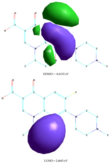 Molecular modeling and quantum chemical studies of the free OFL ligand were helpful in confirming the proposed chemical structures of the synthesized metal complexes [57,58]. Conformational analyses and geometric optimizations were conducted at the semi-empirical PM3 level using the HyperChem 7.5 software [59] (Figure 10 and Table 7). The quantum chemical parameters of Mulliken electronegativity; χ, global softness; S, global hardness; η, global electrophilicity; ω, chemical potential; Pi, electronic charge; ΔNmax, absolute softness; σ, the lowest unoccupied molecular orbital energy; ELUMO, highest occupied molecular orbital energy; EHOMO, the difference between HOMO and LUMO energy levels; and ΔE were obtained using equations described in the literature [60,61,62,63,64] and are listed in Table 7. The high EHOMO value indicated that the OFL ligand behaved as a strong donator and its high ω value likely resulted from its high capacity to accept electrons. The negative values for both EHOMO and ELUMO were attributed to the stability of the synthesized complexes.