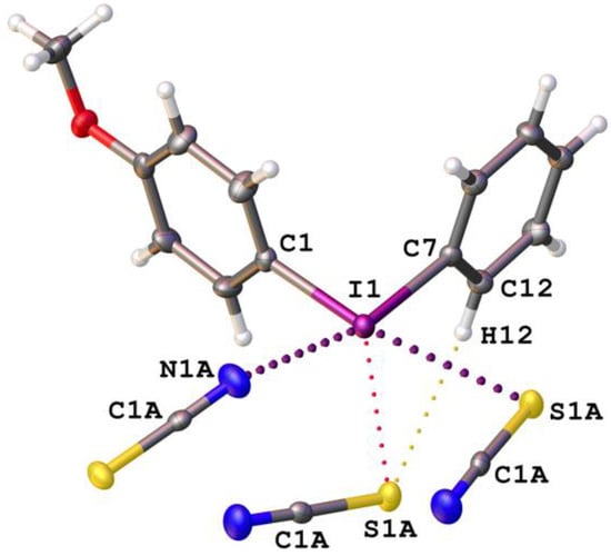 According to our theoretical calculations (Section 3.4), the [PhI(4-C6H4OMe)]+ cation noncovalently interacts with three thiocyanate anions (Figure 2) to form typical C1–I1···S1A and C7–I1···N1A XBs with two SCN− and two weak I1···S1A and H12···S1A contacts with the third SCN−.
