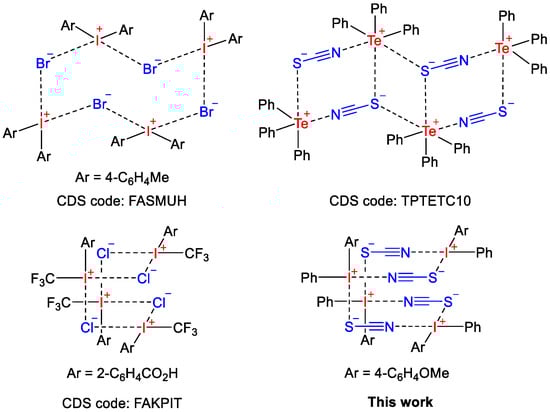 Only one example, [(4-MeC6H4)2I]Br [] (Figure 3, CSD code: FASMUH), of the heterooctameric clusters stabilized by eight XBs between four iodonium cations and their counterions has been reported before our experiments. In this structure, similar to 1, each diaryliodonium cation forms two XBs with counterions, which, however, are Br−. In addition, {(4-MeC6H4)2I}4∙{Br}4 is in another conformation comparing with {PhI(4-C6H4OMe)}4·{SCN}4 in 1.