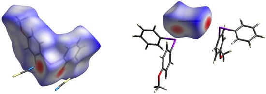 Hirshfeld surfaces for the [PhI(4-C6H4OMe)]+ (left) and SCN− (right) ions.