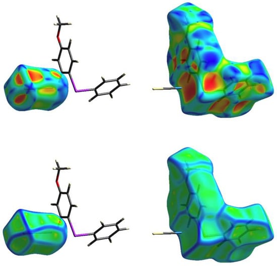 Shape index surfaces (top, color code: hollow—red; bumps—blue) and curvedness index surfaces (bottom, color code: edges—blue; flat regions—green) plotted over the Hirshfeld surfaces of [PhI(4-C6H4OMe)]+ and SCN− ions in the crystal structure of 1.