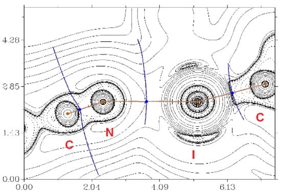 Contour line diagram of the Laplacian of electron density distribution ∇2ρ(r), bond paths and selected zero-flux surfaces referring to intermolecular noncovalent interactions I1···N29 in the model heterooctameric cluster {PhI(4-C6H4OMe)}4·{SCN}4. Bond critical points are shown in blue, nuclear critical points—in pale brown, length units on X and Y axis are given in Å. Numeration of atoms in the model structure corresponds to their ordering in Table S1, Supporting Information.