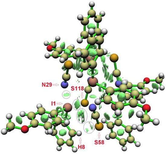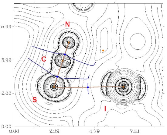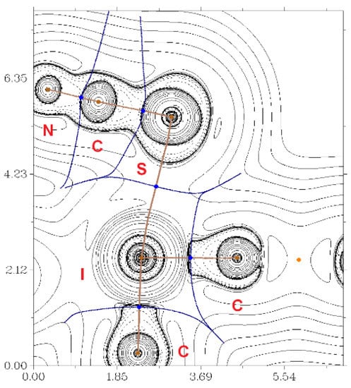 Inspection of the crystallographic data reveals the presence of intermolecular noncovalent interactions I···S and I···N. These weak contacts are responsible for the supramolecular aggregation to furnish the heterooctameric clusters {PhI(4-C6H4OMe)}4·{SCN}4. To confirm or disprove the hypothesis on the existence of these noncovalent interactions and to quantify their energies from a theoretical viewpoint, we carried out DFT calculations at the ωB97XD/DZP-DKH level of theory and topological analysis of the electron density distribution within the framework of Bader’s theory (QTAIM method) [] for the model system (Table 3 and Table S1, Supporting Information). The contour line diagrams of the Laplacian of electron density distribution ∇2ρ(r), bond paths, and selected zero-flux surfaces for the intermolecular noncovalent interactions I···S and I···N providing the heterooctameric supramolecular clusters {PhI(4-C6H4OMe)}4·{SCN}4 are shown in Figure 6, Figure 7, Figure 8 and Figure 9. The visualization of these intermolecular contacts using noncovalent interaction (NCI) analysis based on promolecular electron density [] (high quality grid, ~1,728,000 points in total) is shown in Figure 10.