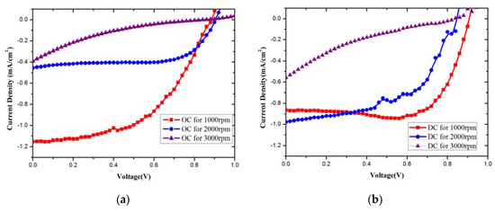 The current density-voltage (J-V) curves of device with different spin-coating speed of (a) original concentration (OC) TiO2 and (b) double concentration (DC) TiO2.