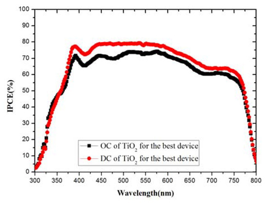 The external quantum efficiency (EQE) spectrum of best device from 300 to 800 nm. The black curve is device obtained by OC TiO2 and red curve is device obtained by DC TiO2.