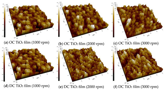 The surface morphologies of atomic force microscope (AFM) with different spin-coating speeds based on OC TiO2 film from (a) to (c) and DC TiO2 film from (d) to (f).