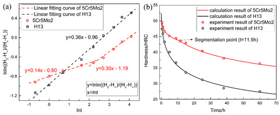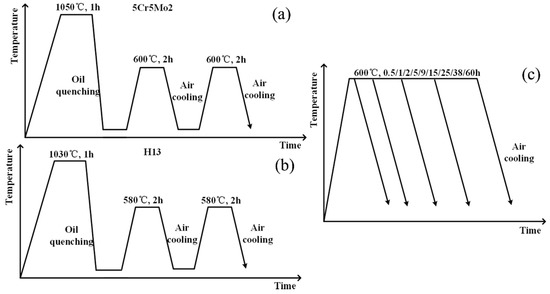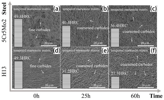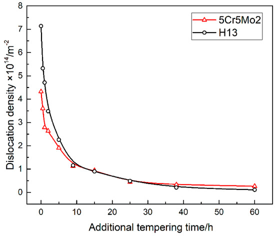 - Initially, the dislocation density of the 5Cr5Mo2 steel was lower than that of the H13 steel due to its different pre-heat-treatment process. Nevertheless, after being exposed to an additional tempering lasting over 25 h, owing to the dislocation pinning by precipitation, the dislocation density exceeded that of the H13 steel.