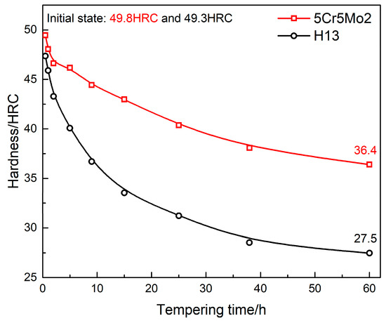 - The designed steel exhibits a superior softening resistance as compared with the common H13 steel. After tempering for 60 h, the hardness of the 5Cr5Mo2 and H13 steels decreased from 49.8 HRC and 49.3 HRC to 36.4 HRC and 27.3 HRC, respectively.