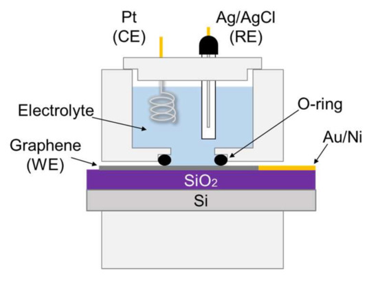 Raman measurements were performed by using an inVia Reflex (Renishaw, Wootton-under-Edge, UK). Electrochemical measurements were performed with a three electrode system, including a graphene film on a SiO2/Si substrate as a working electrode (WE), a platinum wire spiral as a counter electrode (CE), and Ag/AgCl as a reference electrode (RE) by using the polytetrafluoroethylene housing unit cell with a fluorine rubber O-ring defining the measurement area (0.13 cm2), as shown in Figure 2. Cyclic voltammetry (CV) and electrochemical impedance spectroscopy (EIS) measurements were performed by using an Autolab PGSTAT204 potentiostat/galvanostat system equipped with an impedance analyzer FRA32M (Metrohm, Utrecht, The Netherlands). A series of electrochemical measurements was performed without dismounting the graphene electrode from the electrochemical cell because the graphene film may be damaged when detaching the O-ring. We used single sample for each of a series of measurements and in other words, three graphene electrodes were used for the whole experiment in this paper. On the other hand, we conducted similar experiment using other graphene electrodes to verify the findings.