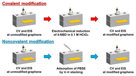 Covalent and noncovalent modifications were performed using a couple of films of monolayer CVD-grown graphene prepared in the same CVD batch. The EIS and CV measurements were carried out before and after modifications. Their schemes are shown in Figure 3. The covalent modification of the graphene surface was performed by grafting of nitrophenyl groups with electrochemical reduction of diazonium salt. Potential cycling was performed in a 0.1 M HClO4 solution containing 1 mM 4-NBD between 0.6 V and −0.4 V by using the graphene electrode with a scan rate of 50 mV/s [22]. The electrochemical modification was performed by using the electrochemical cell shown in Figure 2. A series of electrochemical measurements and modification was performed without dismounting the graphene electrode from the electrochemical cell.