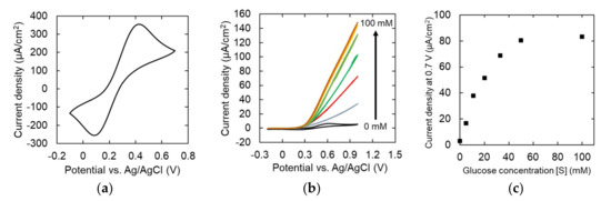 First, we performed an enzyme electrode reaction via a mediator at an individual monolayer graphene electrode on an insulating substrate so as to confirm whether this one-atom-thick material graphene could be used as a platform for investigating the electrochemical properties of a biomolecule/electrode interface. Figure 5a shows cyclic voltammograms (CVs) of a monolayer graphene electrode in a 0.2 M PBS containing 10 mM FcDA as a redox-probe. It exhibited a pair of stable and well-defined anodic and cathodic peaks at 0.43 V and 0.09 V (vs. Ag/AgCl). These redox peak potentials agreed with the reported potentials of the oxidation and reduction of the ferrocene derivative on the carbon electrode [27]. The biocatalytic activation of the GOx utilizing FcDA as a mediator was electrochemically characterized by analyzing the reaction of the glucose oxidation. Figure 5b presents CVs of the monolayer graphene electrode in 0.2 M PBS containing 10 mM FcDA, 10 µM GOx, and 0–100 mM glucose. A notable increase in the biocatalytic current was observed at E > 0.2 V, which corresponds to the oxidation potential of FcDA. The oxidation current increased as the glucose concentration was elevated. Figure 5c shows plots of the biocatalytic current of the CV at a potential of 0.7 V versus glucose concentration. The biocatalytic current exhibited a plateau of 83 µA/cm2 at concentrations higher than 50 mM. This behavior represents Michaelis–Menten kinetics given below: