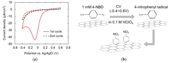 The monolayer graphene electrode surfaces were modified by using two molecular modification methods, the noncovalent and covalent modifications, and then characterized by Raman spectroscopy, electrochemical impedance measurements, and cyclic voltammetry. Figure 6a shows the CVs done using an aqueous solution containing 1 mM 4-NBD and 0.1 M HClO4 for the covalent modification of the graphene electrode. The first cycle showed a broad irreversible peak around −30 mV vs. Ag/AgCl, which was assigned to the reduction of the 4-NBD cations to form the corresponding aryl radicals. The second cycle was featureless, which suggests that the surface was blocked by the products that formed during the first cycle [22]. Figure 6b shows the reported mechanism of covalent modification to the graphene surface caused by the CVs [28]. Covalent modification of graphene from radicals produced from diazonium reagents is the most common method of covalent modification. The mechanism involves the transfer of a delocalized electron from the carbon surface to a diazonium cation and results in the release of a N2 molecule and the formation of a radical species. Subsequently, the radical species attacks a sp2 hybridized carbon lattice atom on the surface forming a covalent bond and converting it into sp3 hybridized carbon [28,29]. For the noncovalent modification, π–π stacking between six-membered ring of graphene sheets and pyrenyl groups of PBSE was utilized.