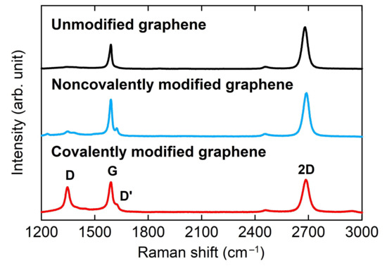 Raman spectra of unmodified, and noncovalently and covalently modified graphene on SiO2/Si substrate.