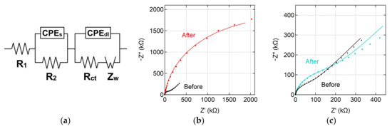 The EIS measurements were performed to observe changes by the molecular modifications in the electron transport properties inside the graphene electrode film and in electron transfer properties across the electrode/electrolyte interface. The impedance spectra were recorded in the frequency range of 100 kHz down to 0.1 Hz with 10 points per decade, at open circuit potential, 0.3 V, using a 10 mV amplitude sinusoidal voltage in 0.1 M PBS containing 1 mM FcDA. We assumed an equivalent circuit based on a Randles-type equivalent circuit, as shown in Figure 8a, including a series resistance, R1, constant phase element associated to the graphene/SiO2/Si structure, CPEs, electrical transport resistance parallel to the CPEs, R2, charge transfer resistance, Rct, constant phase element associated to double layer capacitance, CPEdl, and Warburg element, Zw. These parameters are determined from a curve fitting of a Nyquist plot. Here, we assumed that the monolayer graphene electrodes have larger internal resistance than the resistance of solution used in this measurement condition, and that CPEs is parallel to a part of the electrical transport resistance in the graphene films. Therefore, R1 was regarded as the sum of the solution resistance and a part of the electrode internal resistance and the electrode internal resistance was considered to be included also in R2. Accordingly, the sums of the R1 and R2 were compared before and after the modifications to estimate the variations in electrode internal resistance by the molecular modification because the solution resistance should be almost constant in the same measurement conditions. The Rct values for the electrochemical reaction of FcDA can be directly measured as a semicircle diameter. Figure 8b,c show the Nyquist plots for the graphene electrodes before and after the covalent and noncovalent modifications, respectively. The fitting EIS parameters are listed in Table 1. The black curves in both Nyquist plots show spectra of the unmodified graphene electrodes. The variations in the fitting parameters between both unmodified graphene electrodes are attributed to the errors resulting from the fabrication process including the transferred position of graphene sheet, PMMA residues and microscopic cracks of the SiO2 layer. In the Nyquist plots for the covalent modification, the Rct and the sum of R1 and R2 before modification were determined to be 104 kΩ and 880 Ω, respectively, by equivalent circuit fitting in the impedance spectra. After the covalent modification, the Nyquist semicircle was significantly enlarged, indicating an increase in Rct. The Rct was determined to be 2.75 MΩ, which is approximately 25-fold higher than before modification, while the sum of R1 and R2 was 907 Ω, which is almost maintained. The significant increase in Rct was possibly due to the covalently modified nitro phenyl groups blocking the reaction site of the graphene. This result is consistent with the reduction current in the second cycle for covalent modification being significantly inhibited, as shown in Figure 6a. In comparison, there was no significant change in the sum of R1 and R2 corresponding to the variation of electrode internal resistance. It suggests that the covalent modification partly broke the C-C sp2 bonds and most of the remaining π-conjugated network still worked. For the noncovalent modification, the Rct and the sum of R1 and R2 before the modification were determined to be 67 kΩ and 721 Ω, respectively, and after the modification, these values were changed to be 158 kΩ and 658 Ω, respectively. The decrease in the sum of R1 and R2 after the noncovalent modification indicates the resistance for electric transport in the graphene film decreased attributed to the p-doping effect of PBSE. On the other hand, the slight increase in Rct after the modification is ascribed to butanoic acid, the molecular chains of PBSE, which may interfere the approach of the FcDA to the graphene surface. Nevertheless, the Rct value for the noncovalent modified graphene was much lower than that of the covalent modified graphene and comparable to those before the surface modifications. Thus, noncovalent bonds using π–π stacking allow molecular modifications without degrading the resistance properties of the graphene.
