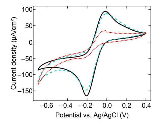 CVs of unmodified (solid line, black), and covalently (dotted line, red) and noncovalently (dashed line, cyan) modified graphene electrodes for 1 mM hexa-ammine-ruthenium (III) in 0.1 M KCl at scan rate of 100 mV/s.