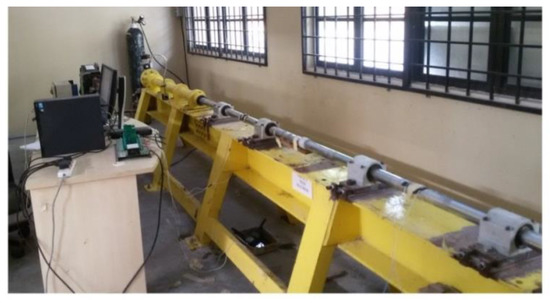 An electric kiln with a maximum temperature of 1000 °C and capacity of three concrete cubes was used to carry out the heating process according to ISO 834 fire curve [44]. After two hours, the heating process was stopped and the specimens were left to gradually cool down within the room temperature. The average static compressive strength of three cubic samples for both concrete was recorded at curing ages of 7, 28 and 90 days within room temperatures of 400 and 700 °C according to British standards by using a compression machine with a maximum load capacity of 5000 kN [45]. The SHPB machine was used to perform the dynamic test at strain rates between 30.09 and 102.48 s−1 as shown in Figure 2 [46,47]. The machine bars were manufactured from a stainless steel material with a diameter of 50 mm which was selected to reduce the wave dispersion and increase the accuracy of the recorded signals [46]. A hand grinder was used to decrease and achieve good contact between the bars and concrete samples. Moreover, an alignment by a laser with a precision reached up to 0.01 mm was used to accomplish a good coaxial and fulfil the force equilibrium condition [46]. The average dynamic strength of five cylindrical samples (350 samples) for both concrete was recorded at each exposing temperature and curing age.