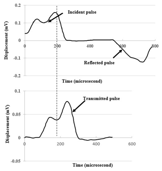 Displacement time-history records of the incident, reflected and transmitted pulses during the test.