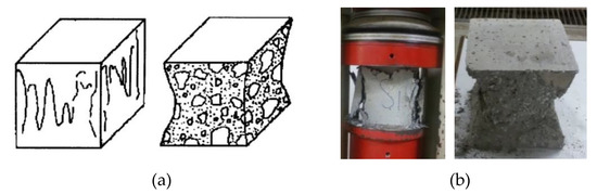 British standards (BS 1881-101) [57] defined the satisfactory failure modes of cubic concrete samples under compression load as shown in Figure 4a. The results appeared a good agreement with the British standard for both concrete samples that mainly failed by cracking the four faces of concrete cube equally within slight damage in its connected face with plates as shown in Figure 4b.