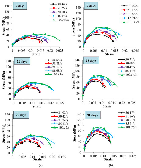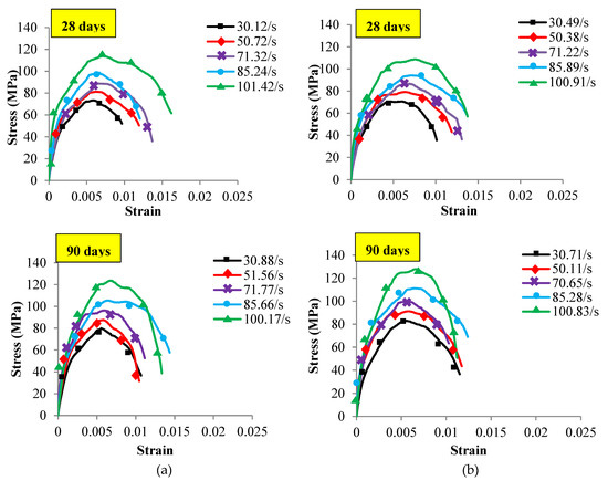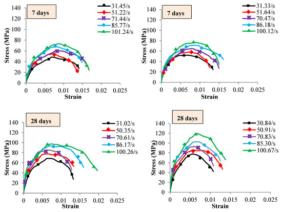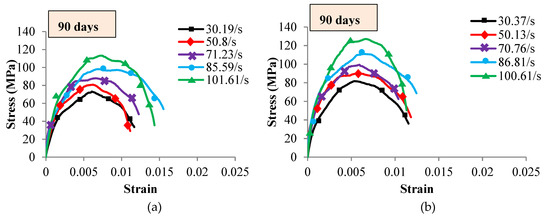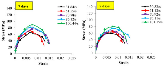 The peak value of the stress–strain diagrams is considered as the ultimate dynamic strength () of both concrete samples. The downward part of the diagrams signified the strain relaxing and fragmentation of concrete specimens after the ultimate stress [58]. The average of five strain rates is recorded at each curing age tested within different temperatures and strain rates as shown in Figure 5, Figure 6 and Figure 7. The diagrams indicated that the dynamic strength of both concrete linearly increased with the strain rate at all the investigated curing age as shown in Table 5. The dependency of dynamic strength with strain rate was noted by several scholars on concrete and other materials such as steel [59], ceramics [60], composites [61] and rocks [62,63]. Grady [64] attributed this behaviour to the growing of tensile micro-cracks on the rocks. While Ross et al. [65] revealed that the moisture of concrete could add inertia forces and increase the fracture strength of wet concrete compared with dry.
