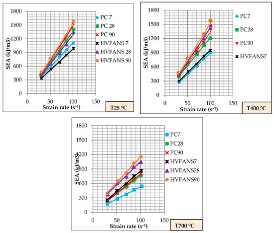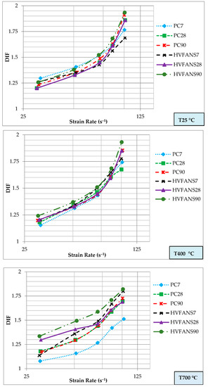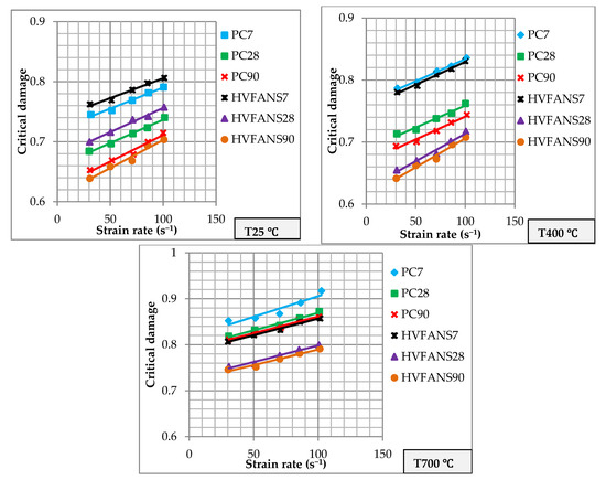 The values of critical strain () described in Figure 5, Figure 6 and Figure 7 clarify the ductility of both concrete at curing ages of 7, 28 and 90 days within exposing temperatures of 25, 400 and 700 °C under different ranges of strain rate. The results showed that the strain increased linearly with the strain rate at all the investigated cases owing to the lateral confinement that could form high quantities of micro-cracks and prevent the formation of macro cracks [66,67]. Moreover, the outcomes revealed the important role of PP fibres under dynamic loads due to its ability to improve the concrete ductility as well as produce channels to release vapour pressure at high temperatures which clearly reduced the critical strain values particularly at temperatures of 25 and 400 °C [68,69,70]. The highest values of critical strain for both concretes are recorded at a curing age of seven days and exposing temperature 700 °C, however, HVFANS concrete showed smaller values as compared to PC within a maximum difference of 43.56% at a strain rate above 100 s–1 owing to improve nano-silica at elevated temperatures [68,69]. On the other hand, the critical strain showed a positive relationship with the increase of curing age and recorded the smallest values at 90 days at the same exposing temperature due to the increase of fly ash reactivity and hydration process which enhance the concrete structure.