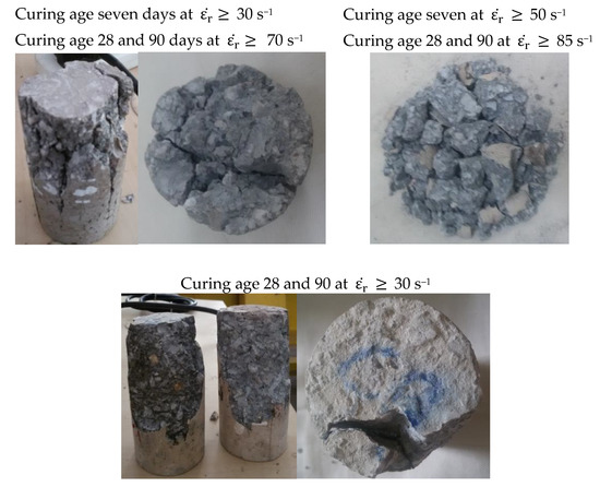 Figure 10 showed that the failure of both concretes was violent whereas the cylindrical specimens were destroyed into pieces at high strain rates. Three crack patterns were observed for both concrete with the increase of curing age. The cracks were clearly straight and passed through a large area that has more broken aggregate that occurred at a curing age of seven days with a strain rate of 30 s−1 as well as at 28 and 90 days within strain rates above 70 s−1. The number of cracks in concrete samples was considerably increased and resulted in serious destruction into small pieces to release the internal energy that occurred at a curing age of seven days with strain rate above 50 s−1 as well as at curing ages of 28 and 90 days within strain rates above 85 s−1. While the crack path was passed through the concrete mortar only at curing ages of 28 and 90 days within strain rates between 30 and 70 s−1.
