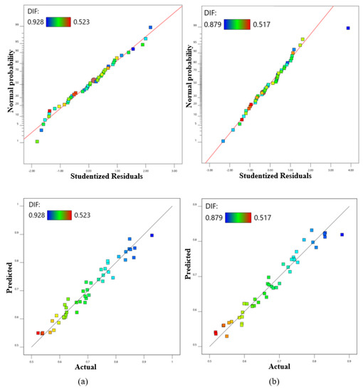 The outcomes of ANOVA variance analysis indicated an excellent accuracy for the adopted model to estimate the DIF of both concretes within correlation coefficient () values close to one as indicated in Table 6 [80,81]. Furthermore, the differences between Predicted and Adjusted R2″ was less than 0.2 within Adequate Precision (AP) of more than four that measured the noise-to-signal ratio [82].