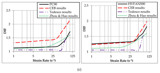 The DIF diagrams of both concrete compared with the outcomes of the above equations at different curing ages and exposing temperatures within strain rate range reached up to 102.48 s−1 as shown in Figure 13. At room temperature, the CEB expression was more accurate to estimate the DIF of both concrete within differences range between 0.092% and 25.30% particularly observed at higher strain rate above 30 s−1 within curing ages of 7 and 28 days. At 400 °C, the results of the proposed expression by Zhou and Hao [86] were more close to the determined DIF especially at early ages of 7 and 28 days. However, some variances were noted at an age of 90 days in the case of HVFANS concrete and the comparison proved that the CEB model is more appropriate to predict the performance of this concrete type at 400 °C that may attribute to the increase of the FA and NS reactivity at late age during the heating process. At 700 °C, Tedesco’s expression was more appropriate to estimate the behaviour of PC at the early age of seven days. Zhou and Hao’s expression revealed good ability to predict the performance of PC with the increase of curing age to 28 and 90 days as well as in the case of HVFANS concrete at seven days. On the other hand, the CEB model showed the good capability to estimate the DIF of HVFANS concrete at curing ages of 28 and 90 days as compared to other expressions due to the low degradation in strength at 700 °C.