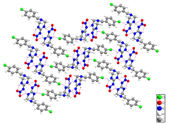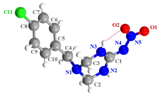 As shown in Table 2, all bond lengths and angles are generally within normal ranges and in a good agreement with those reported previously [34,35,36,37,38,39,40]. The C–C bond lengths of benzene ranged from 1.380(2) to 1.396(2) Å, which were extremely close to C–C bond lengths (1.373(3) to 1.393(2) Å) of benzene in compound (E)-5-benzyl-1-methyl-N-nitro-1,3,5-triazinan-2-imine [34]. In the 1,3,5-triazine ring (C1/C2/C3/N3/N2—N1), four of the six amino C–N bonds were shortened equivalent C–N single bond (1.49 Å) [41]. The bond lengths of N(2)–C(2), N(3)–C(3), N(1)–C(2) and N(1)–C(3) were 1.4743(19) Å, 1.472(2) Å, 1.4476(18) Å and 1.4453(19) Å, respectively. The remaining two amino bonds N(2)–C(1) [1.3310(19) Å] and N(3)–C(1) [1.3277(19) Å] were equivalent partial double bonds [37], shorten than that of N(2)–C(2), N(3)–C(3), N(1)–C(2) and N(1)–C(3), which suggested that the electron density of the imino C(1)–N(4) bond p-electrons was delocalized among N(2)–C(1)–N(4) and N(3). This phenomenon also existed in other crystal structures bearing NHT ring, such as (E)-5-benzyl-1-methyl-N-nitro-1,3,5-triazinan-2-imine [34], 1,5-dimethyl-2-nitroimino-1,3,5-triazinane [35], 1-(2-chloro-1,3-thiazol-5-ylmethyl)-3,5-dimethyl-2-nitrimino-1,2,3,4,5,6-hexahydro-1,3,5-triazine [36] and 2-nitrimino-5-nitro-hexahydro-1,3,5-triazine [37]. The length of the imino bond C(1)=N(4) was 1.3707(19) Å, which was significantly longer than above two amino bonds N(2)–C(1) and N(3)–C(1) in the 1,3,5-triazine ring. The distances of resemble guanidine structures with nitro group were found in literatures with similar values from 1.342 to 1.389 Å [34,35,36,37,41,42]. However, these distance values were longer than those of reported C=N bonds with nitro group with values between 1.267 and 1.275 Å [43,44,45,46,47]. Bracuti commented molecular interaction and intermolecular H-bonds in crystal structure had responsibilities for this elongation of hydrazine C=N bond [37]. Meanwhile, the length of nitrimino bond N(4)–N(5) (1.3405(17) Å), a partial double bond, was similar with reported nitrimino bond distance (1.322–1.362 Å) [34,35,37,41]. In particular, it was similar with the distance of nitrimino bond in 1,5-dimethyl-2-nitroimino-1,3,5-triazinane, regardless of trans and cis configuration [35]. But it was longer than the length of nitrimino bond (1.294 Å) in 1-(2-chloro-1,3-thiazol-5-ylmethyl)-3,5-dimethyl-2-nitrimino-1,2,3,4,5,6-hexahydro-1,3,5-triazine [36]. The Cl(1)–C(8) bond length was 1.7538(15) Å, which corresponds to typical values for the C(sp2)–Cl bond length.