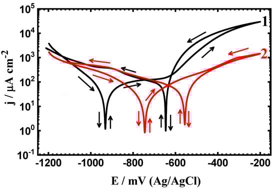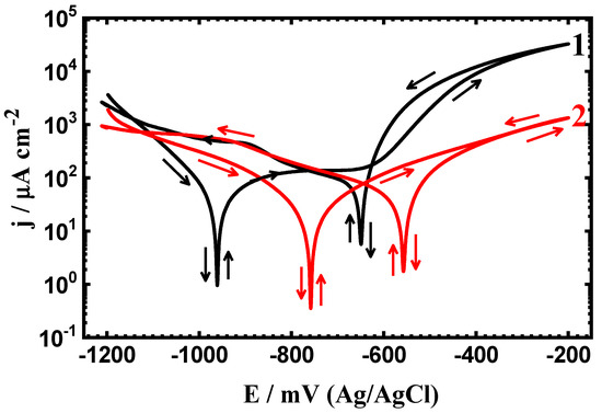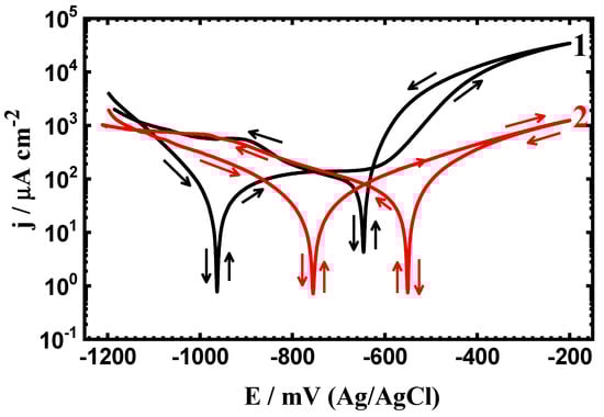 Evaluating the polarization is a well-known technique in understanding the corrosion and corrosion mitigation of metallic materials in corrosive solutions [25,26,27,28,29]. The PCP curves of (1) API-2H steel and (2) 75%Cr3C2−25%NiCr coated API-2H steel after 1 h exposure in 4% NaCl solutions are depicted in Figure 1. The same measurements were also carried out for the same materials after 24 h and 48 h immersion in the test solution and the curves are shown in Figure 2 and Figure 3, respectively. The parameters obtained from Figure 1, Figure 2, and Figure 3 are listed in Table 1. Here, βc is the cathodic Tafel slope, ECorr is the corrosion potential, βa is the anodic Tafel slope, jCorr is the corrosion current density, EProt is the protection potential before which the pitting corrosion does not occur, and RCorr is the corrosion rate. The βc, ECorr, βa, and jCorr values were calculated as previously reported [28,29,30]. The values of RCorr, which are mostly expressing the uniformed corrosion, were calculated using the following equation [31]: