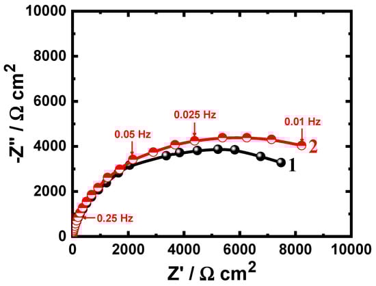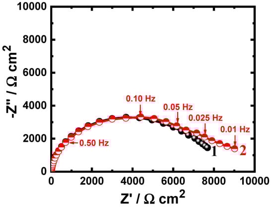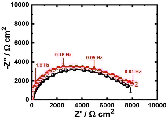 Extending the time of immersion to 24 h is shown to reduce the diameter of the plotted semicircles for both bare and coated API-2H steel electrodes, as can be seen from Figure 5. Further decreasing of the diameter of the semicircle was obtained upon increasing the immersion time to 48 h, as depicted in Figure 6. This means that the increase of immersion time at the same condition decreases the corrosion resistance of the tested electrodes. This was further confirmed by the data shown in Table 2, where the increase in exposure time decreases the values of the surface and polarization resistances, RS and RP. The value of YQ was also found to slightly increase with the increase of immersion time and thus the dissolution of both uncoated and coated API-2H steel increase. In all cases, the corrosion resistance for the coated API-2H steel has a greater value as compared to the uncoated API-2H steel at all exposure times.