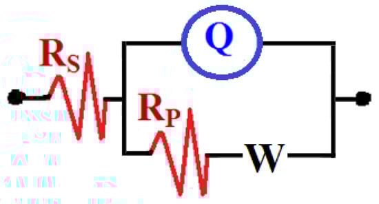 EIS experiments have been carried out to understand the impedance parameters for studying the influence of 75%Cr3C−25%NiCr coating and also, the effect of increasing the exposure time on the corrosion of API-2H steel in 4.0% NaCl solutions. Figure 4 shows the Nyquist plots of (1) API-2H steel and (2) 75%Cr3C2−25%NiCr coated API-2H steel after 1 h immersion in 4% NaCl solutions. The measurements were also obtained for API-2H steel and coated API-2H steel after 24 h and 48 h and the Nyquist plots are depicted in Figure 5 and Figure 6, respectively. All impedance data were analyzed and fitted to the equivalent circuit model shown in Figure 7. The values of the parameters obtained from fitting these data are listed in Table 2. The elements of the equivalent circuit are defined as following; RS the solution resistance, Q the constant phase elements (CPEs), RP the polarization resistance and can be classified as the charge transfer resistance between the surface of the uncoated/coated API-2H steel and the chloride solution interface, and W is the Warburg [33].
