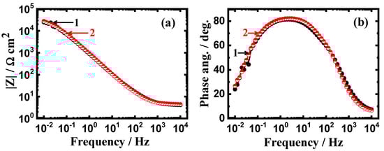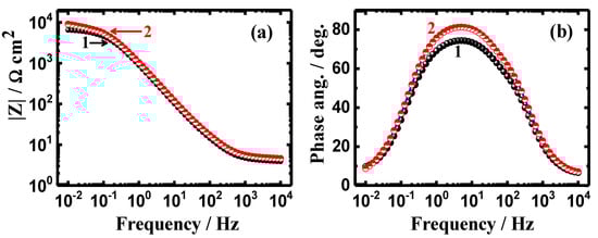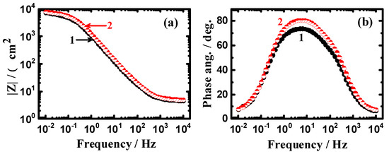 Change of (a) |Z| and (b) Φ with frequency plots obtained for (1) API-2H steel and (2) 75%Cr3C2−25%NiCr coated API-2H steel after their immersion in 4% NaCl solution for 24 h.