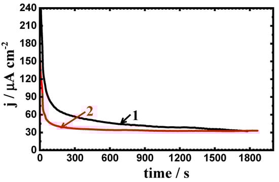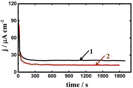 The obtained current vs. time curves at −700 mV for (1) API-2H steel and (2) 75%Cr3C2−25%NiCr coated API-2H steel after immersion in 4% NaCl solution for 24 h.