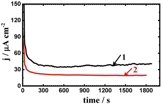 The obtained chronoamperometric current–time curves at −700 mV (Ag/AgCl) after prolonging the exposure time to 24 h for (1) API-2H steel and (2) 75%Cr3C2−25%NiCr coated API-2H steel are shown in Figure 12. The current values decreased from the first moment of the measurement with a slight decrease with time. Here, the values of current obtained for uncoated API-2H steel slightly increased, accompanied with little fluctuations after 10 min of stepping the potential and until the end of the experiment, which reveals that the occurrence of pitting attack on the surface of API-2H steel. On the other side, the recorded currents for the coated API-2H steel slightly decreased confirming that there was no pitting corrosion occurred at this potential.