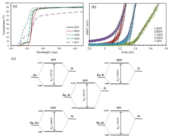 (a) Transmittance spectra, (b) band gap energy, and (c) schematic images and binding structures of undoped ZnO and group III elements (B, Al, Ga and In)-doped ZnO thin films at a doping level of 3%.