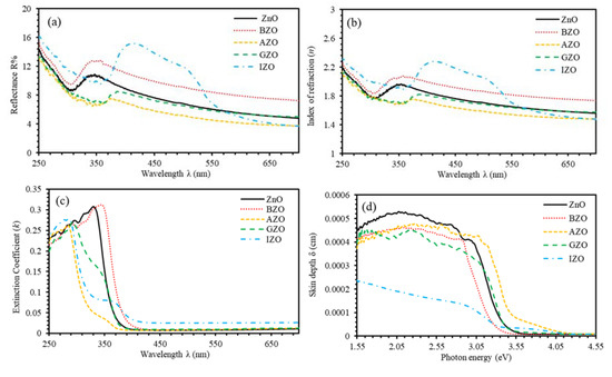 (a) Reflectance spectra, (b) index of refraction spectra (n), (c) extinction coefficient spectra (k), and (d) dependence of the skin depth on the photon energy of undoped ZnO and group III elements (B, Al, Ga, and In)-doped ZnO thin films at 3% doping concentration.