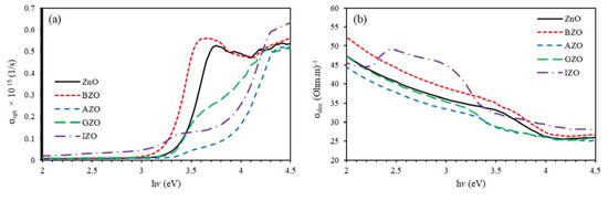 (a) The variation of the optical conductivity with the photon energy, and (b) the variation of the electrical conductivity with the photon energy of undoped ZnO and group III elements (B, Al, Ga, and In)-doped ZnO thin films at 3% doping concentration.