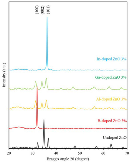 The X-ray diffraction patterns of undoped ZnO and group III elements (B, Al, Ga, and In)-doped ZnO thin films at 3% doping concentration.