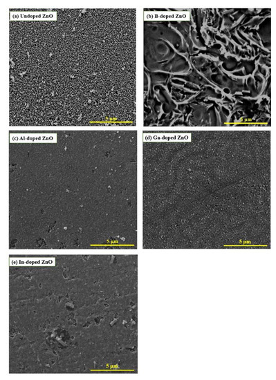 SEM micrographs of (a) undoped ZnO, (b) B-doped ZnO, (c) Al-doped ZnO, (d) Ga-doped ZnO, and (e) In-doped ZnO thin films.